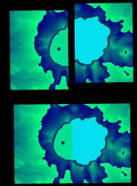 The two source files are off in elevation about three feet. As our new elevation unit is centimeters (cm), we have a difference of 95 cm. The elevation is coded RED/GREEN/BLUE with the BLUE part the most significant byte.